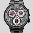 The hand-wound mechanical movement of the Centigraphe indicates elapsed times from a 100th of a second to 10 minutes, visible on 3 dials, each with a time scale in red and a tachometer scale in black.