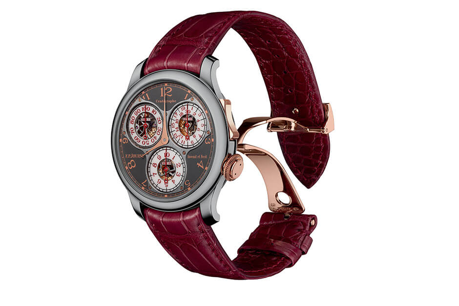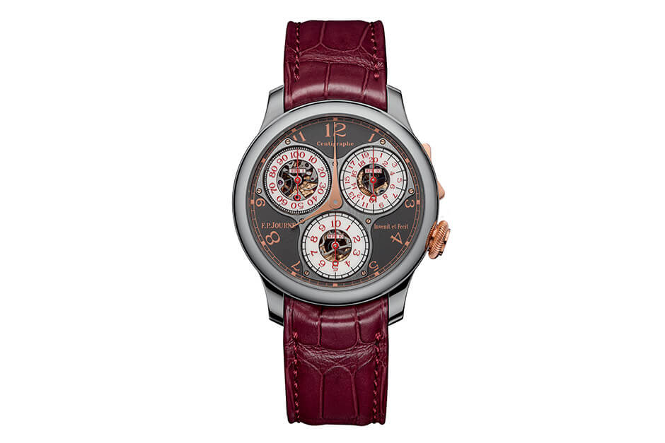 The Centigraphe Anniversaire is the only watch in F.P.Journe’s Classique collection to use a polished Titanium case. The 40mm case is accented by a crown, patented chronograph rocker switch and deployant buckle in 18K 6N Gold. Further distinguishing the Centigraphe Anniversaire from the now discontinued Centigraphe Souverain is the dial, now in Ruthenium with Gold printing and sapphire subdials with open centers, exposing the solid 18K rose Gold movement.
