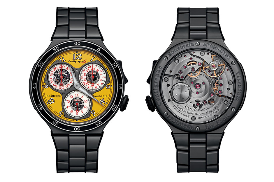 F.P.Journe introduces a new design for the Centigraphe and the Automatique Réserve. The two models are available with a 44 mm diameter case in Titanium grade 5 of anthracite color with an assorted bracelet. The bezel in Titanium and ceramic follows the codes of the Chronographe Rattrapante with numbers engraved in the Titanium base. For the first time, a new bright yellow dial brings a new intensity to the lineSport with luminescent appliqué numbers surrounded with black as well as sapphire counters with red numbers.