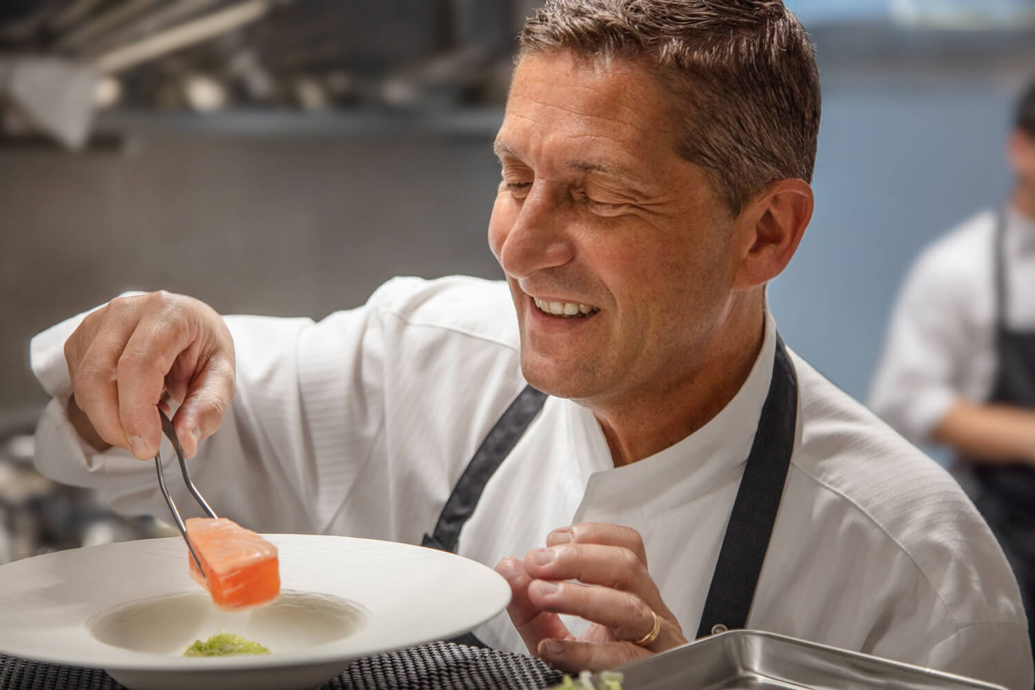 Aux fourneaux, Dominique Gauthier, chef émérite. Il débute son apprentissage à 14 ans, et gravit les échelons au sein de grandes tables françaises. Il accède aux sommets de la gastronomie suisse, sans prétention, récoltant les éloges et la fidélité de sa clientèle. Après trois décennies au service du « Chat Botté » à Genève, il fait le choix audacieux de se réinventer.