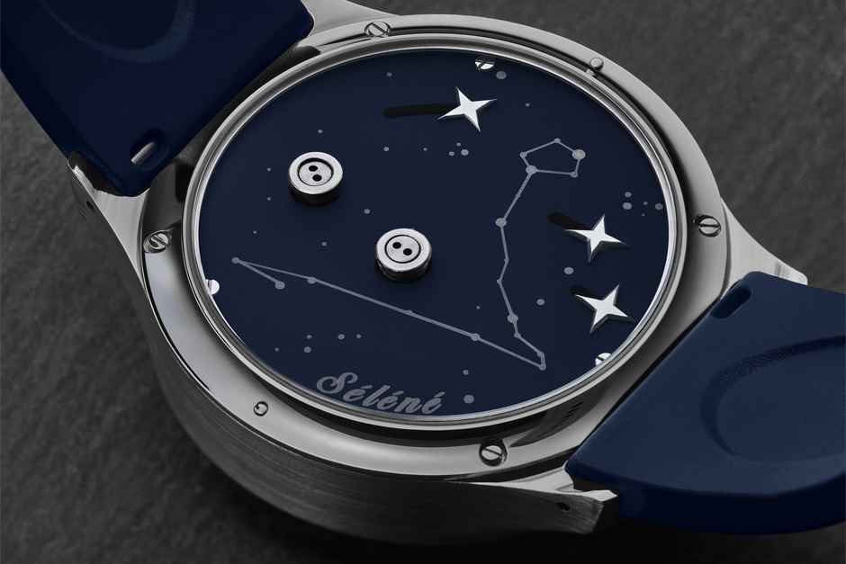 Séléné est une montre deux aiguilles mécanique avec une réserve de marche de 46 heures. Sa boîte en acier inoxydable 316L de diamètre 43 mm et de hauteur 13 mm (avec la glace) pour 110 g. Elle a une intégration de bracelet particulière, sans cornes, lui donnant un aspect élancé et un côté aérodynamique que l'on peut retrouver dans les fusées spatiales. Le choix d'un bracelet en caoutchouc vise à obtenir un côté sportif et c'est aussi une matière qui offre de nombreuses options en termes de couleurs et d’aspect.