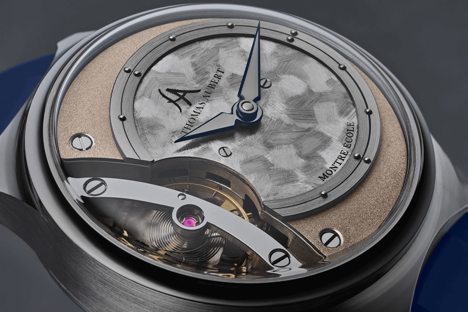 Les aiguilles sont en acier. Elles ont un anglage poli bleui et elles sont reprises sur la surface par un poli bloqué pour plus de contraste. Le pont trois-quarts et la platine sont en maillechort avec une finition sablée et grattée dans les poches. Le pont d'ancre est en acier sablé et anglé, et le pont de balancier est poli bloqué sur toute la surface et anglé.