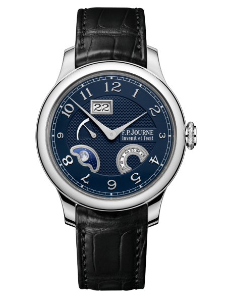 La complication des phases de lune reproduit l’évolution du cycle lunaire. Elle repose sur un disque orné de deux lunes opposées, entraîné par une roue dentée, reproduisant ainsi le rythme naturel des différentes phases lunaires. Chez F.P.Journe, cette complication se déploie sur un disque en saphir délicatement orné d’étoiles obtenues par métallisation, sublimé par une représentation de la lune gravée au laser, inspirée d’une image de la NASA.